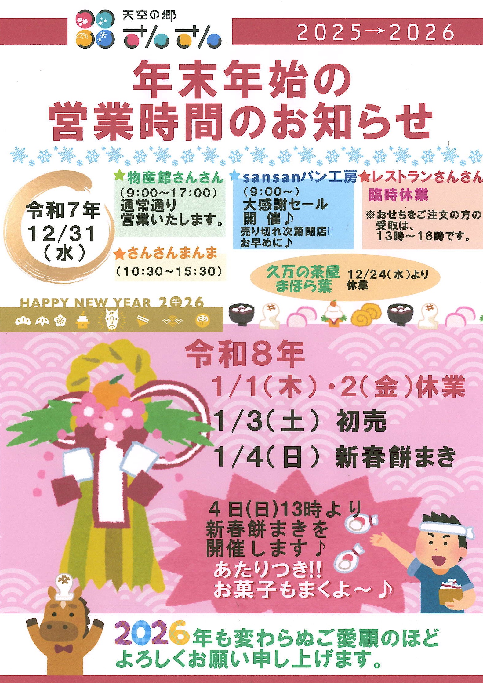 本年も「道の駅 天空の郷さんさん」を、ご愛顧のほどどうぞよろしくお願いいたします。